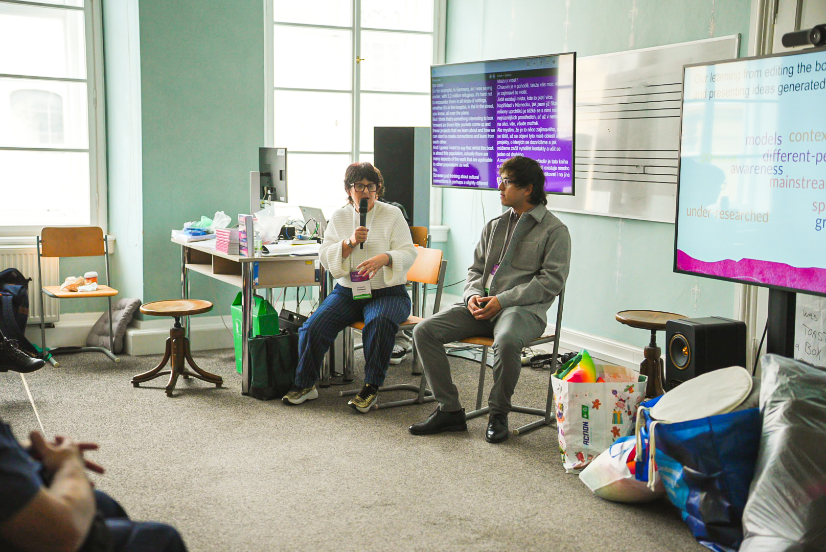 Through the browser interface, attendees could select their preferred language (English, Czech, or Slovak). We used the same QR code system consistently across sessions, with a specific variant only for Slovak. - Real-Time Text and Audio Translation